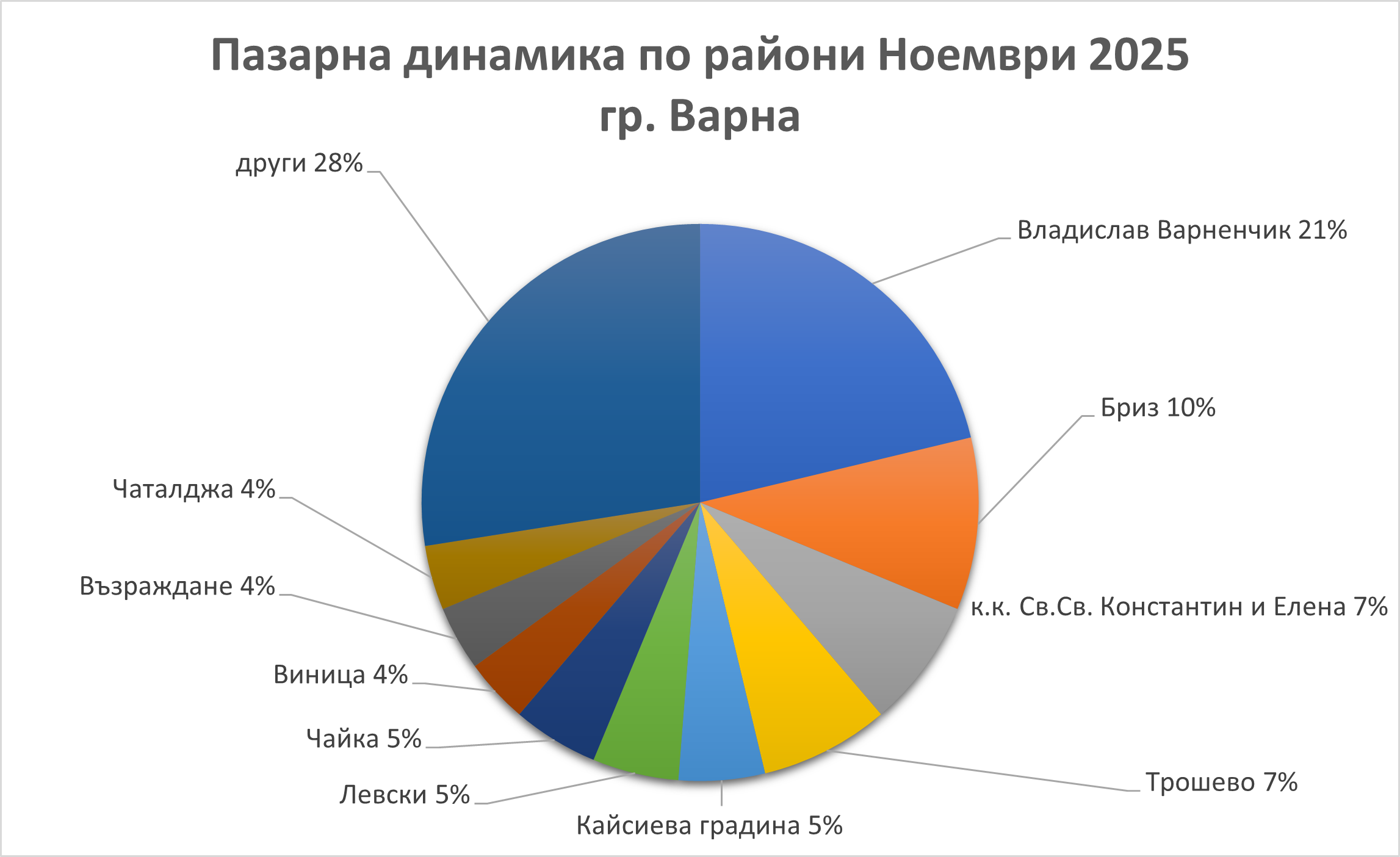 Ноември потвърди тенденцията към стабилност и умерена активност, характерна за късната есен. Пазарът на недвижими имоти във Варна се задържа балансиран. Не се забелязват резки колебания в обема на сделките или интереса към отделни сегменти. Купувачите остават предпазливи, но активни, като търсят имоти с добра локация и рационално съотношение между цена и качество.