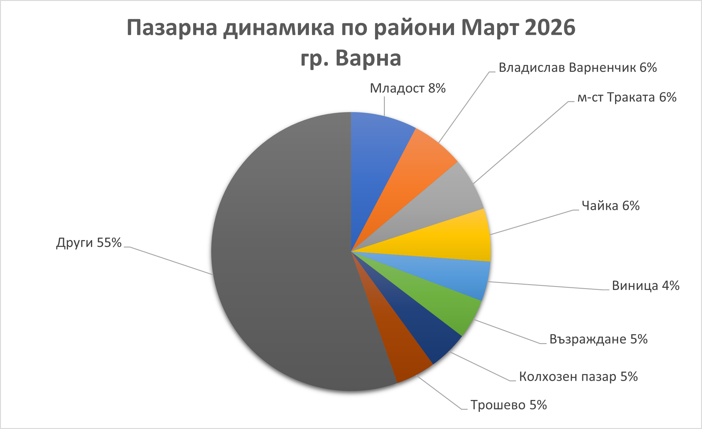 Най-същественият факт тук не е кой квартал е на първо място, а че 55% от сделките попадат в групата „Други“. Това означава, че през март няма ясно изразен район, който да концентрира голяма част от активността. Вместо това, пазарът работи широко и на микрониво – в отделни квартали, с различен тип търсене и с по-локална логика.